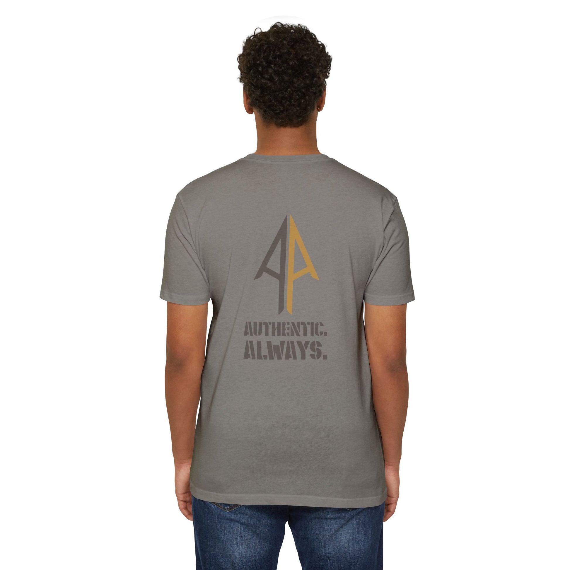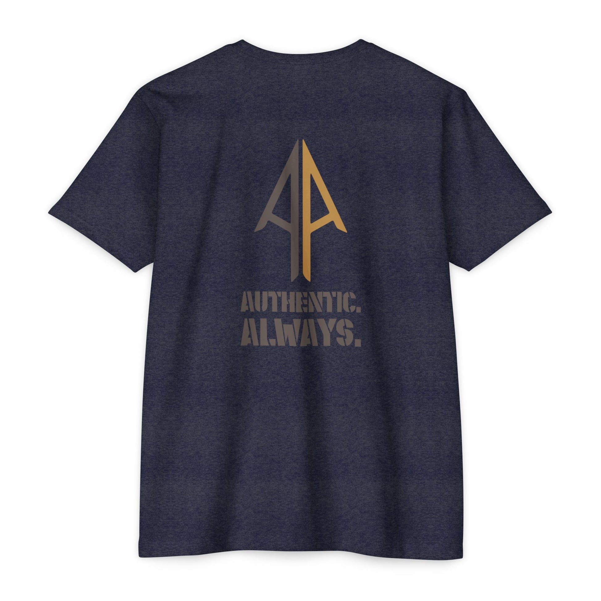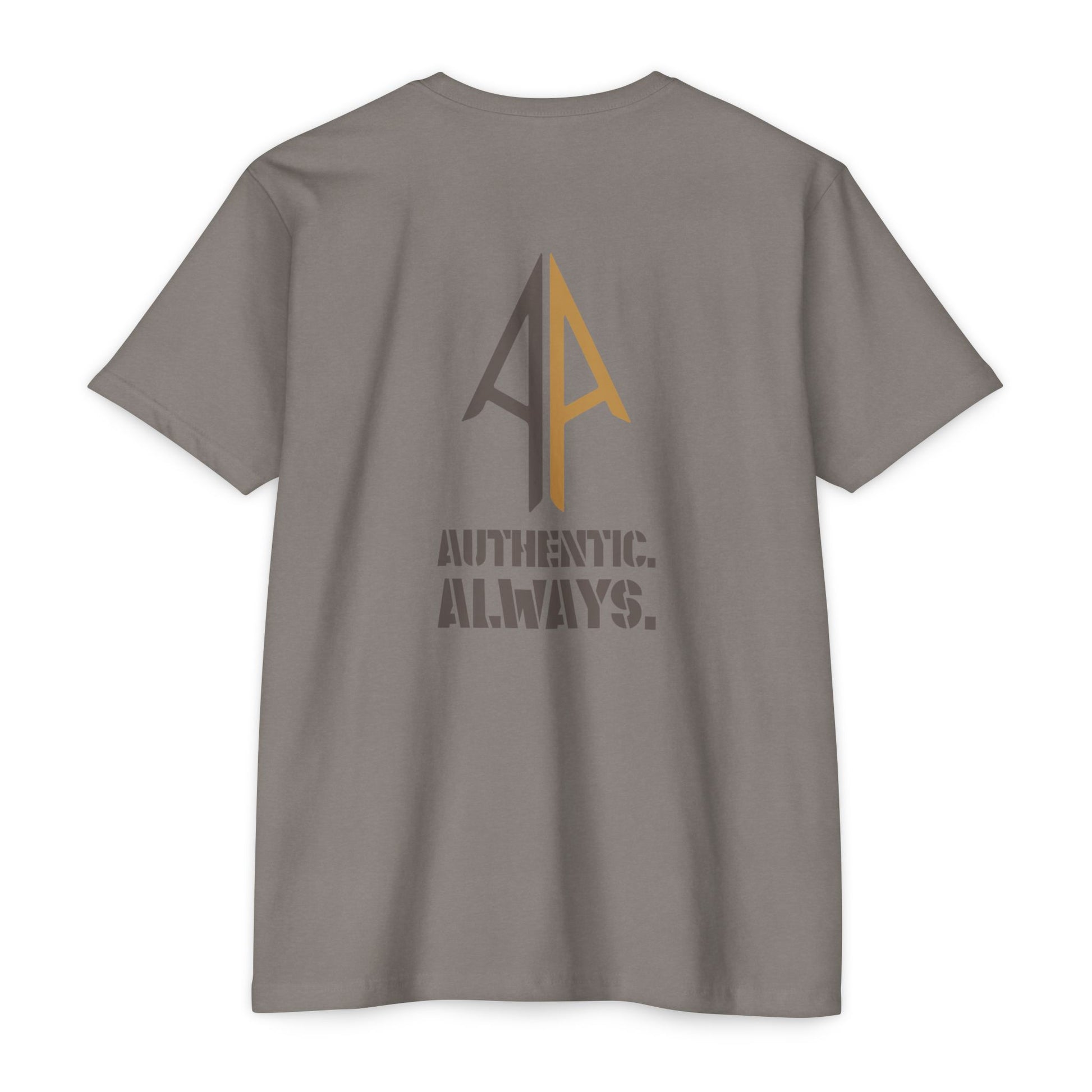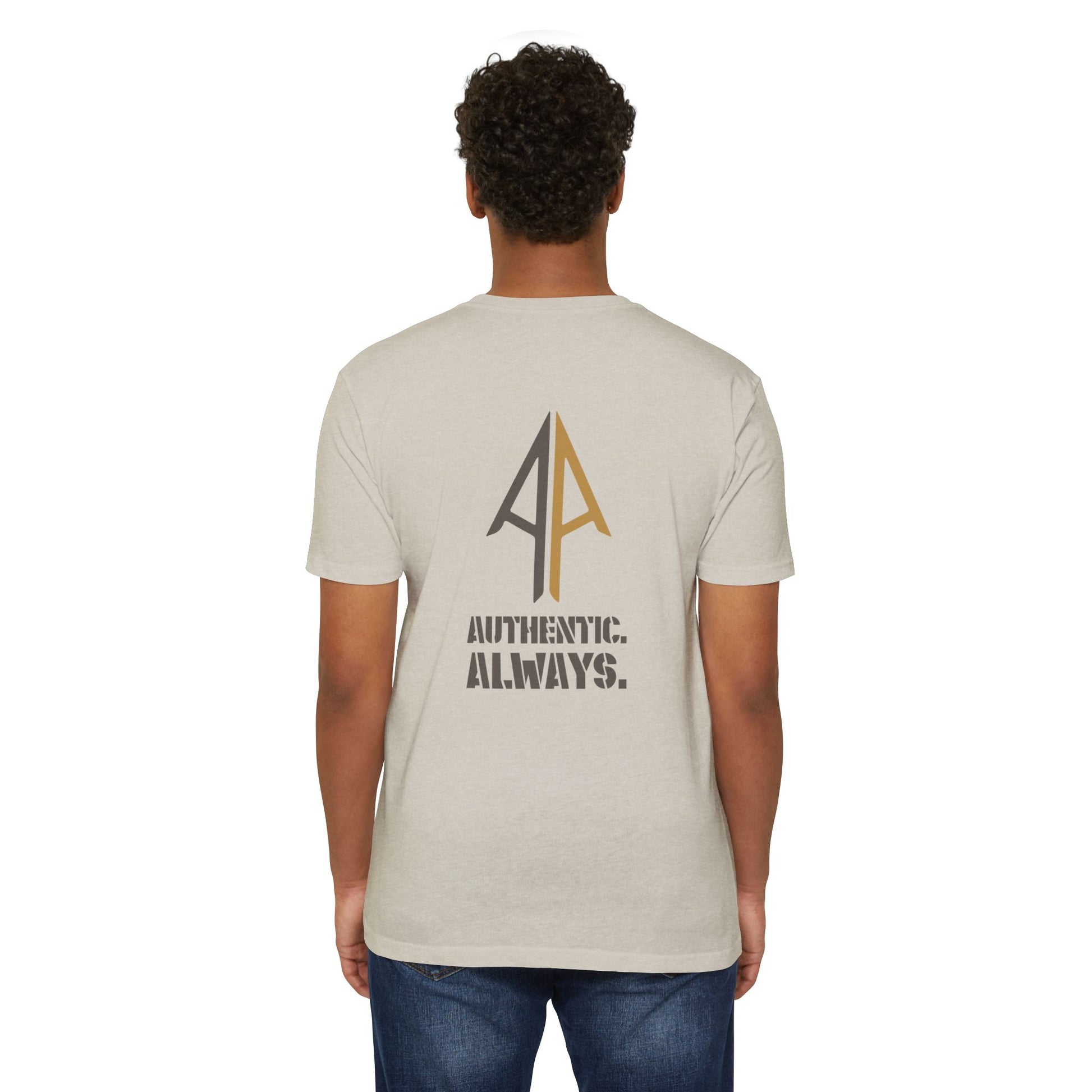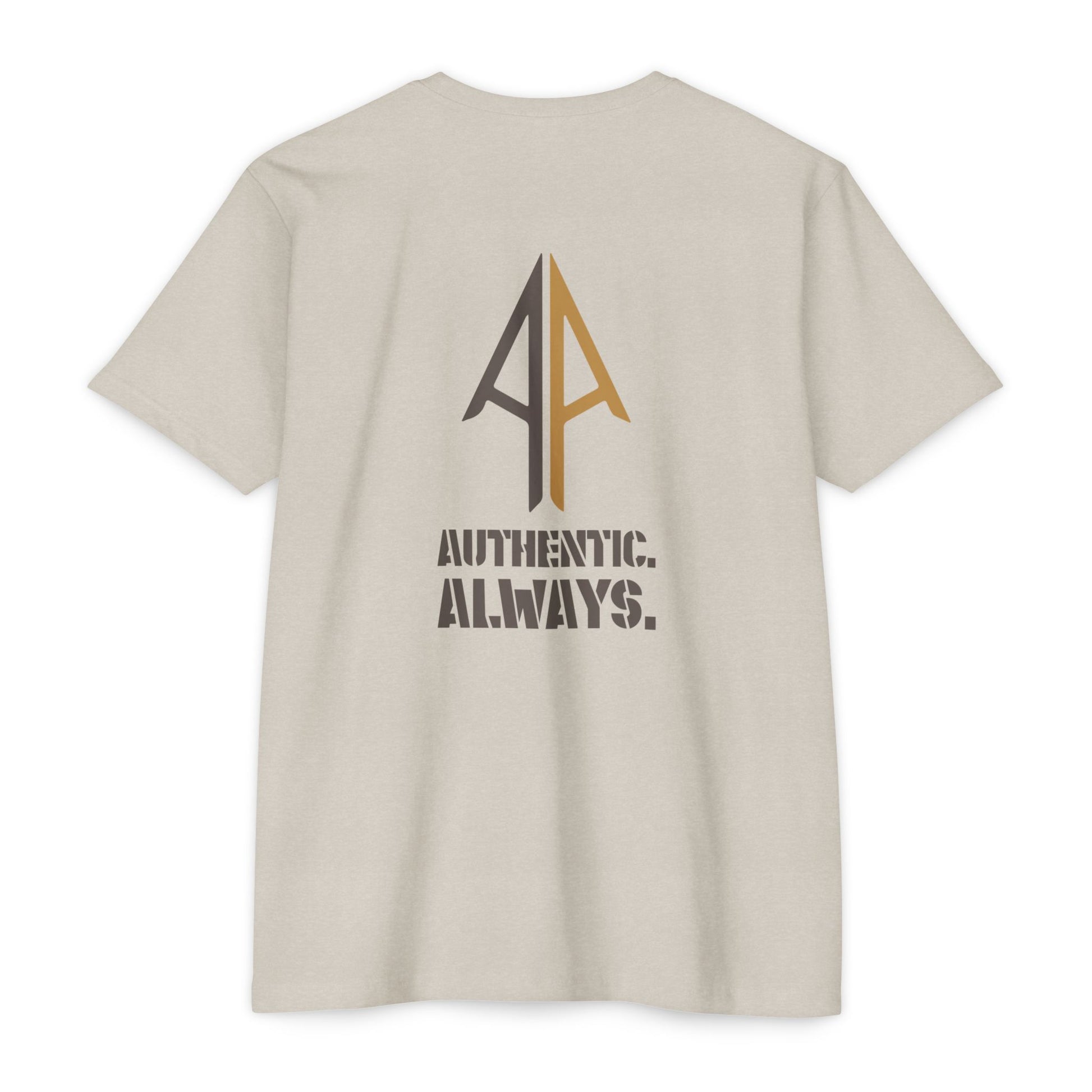 Up front, the double-A arrow logo makes a subtle statement in two shades of brown — a grounded nod to balance, strength, and direction. On the back, that same arrow stands tall and bold, with Authentic. Always. printed beneath it as a reminder to move with purpose and stay true to your path.